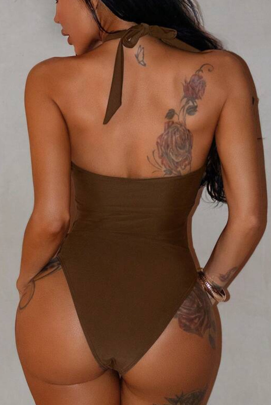 1-piece Brown hollow out halter with removable pads with high cut bottom with slight stretch
