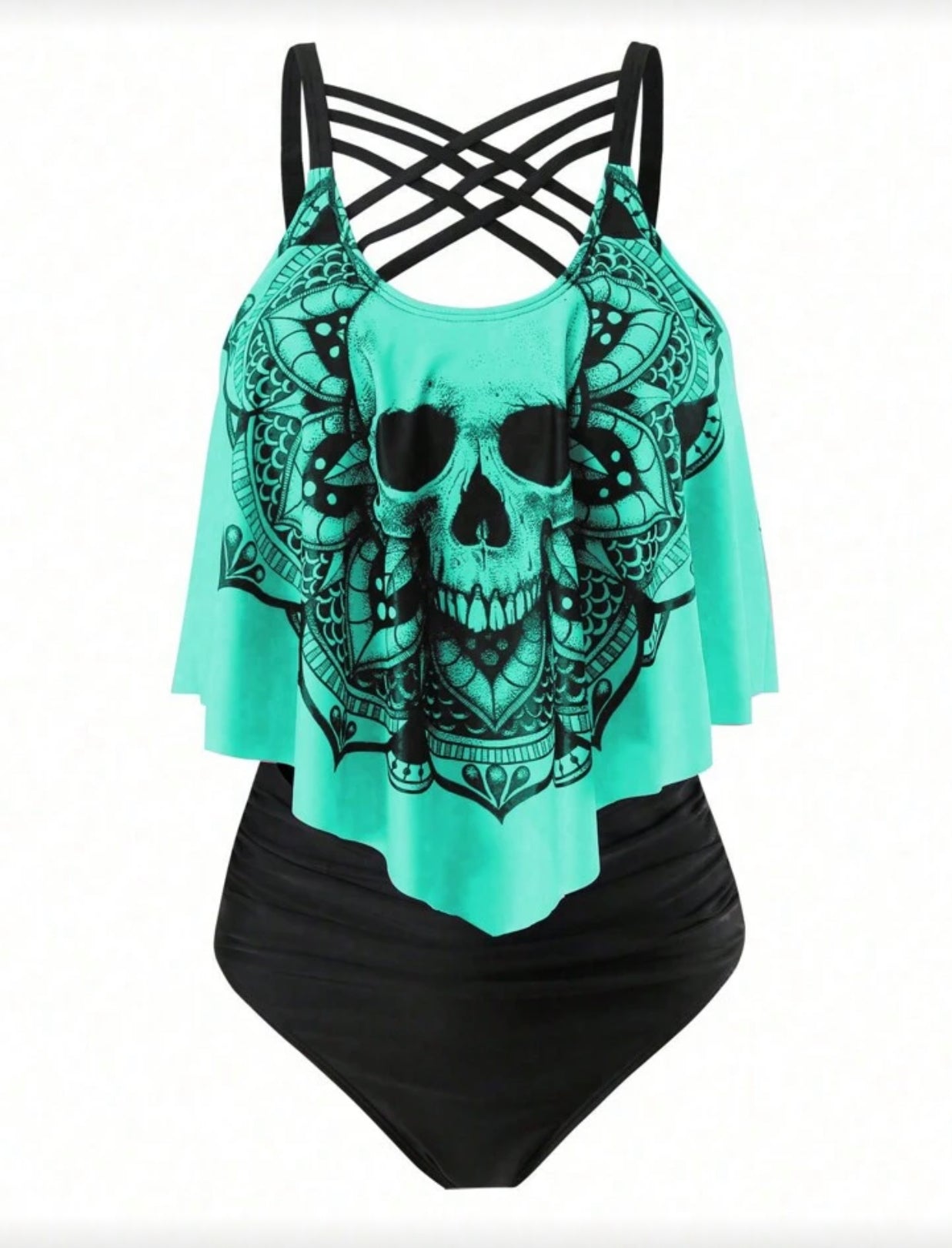 Plus size seafoam 2-piece strappy wireless bra with removable pads and adjustable straps skull print tankini with high waist bottoms made of high stretch