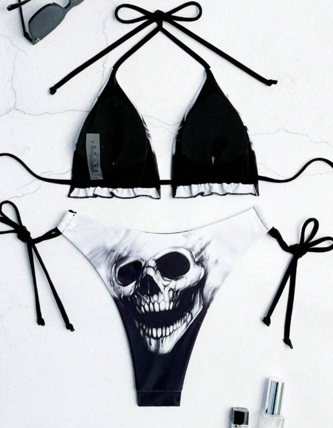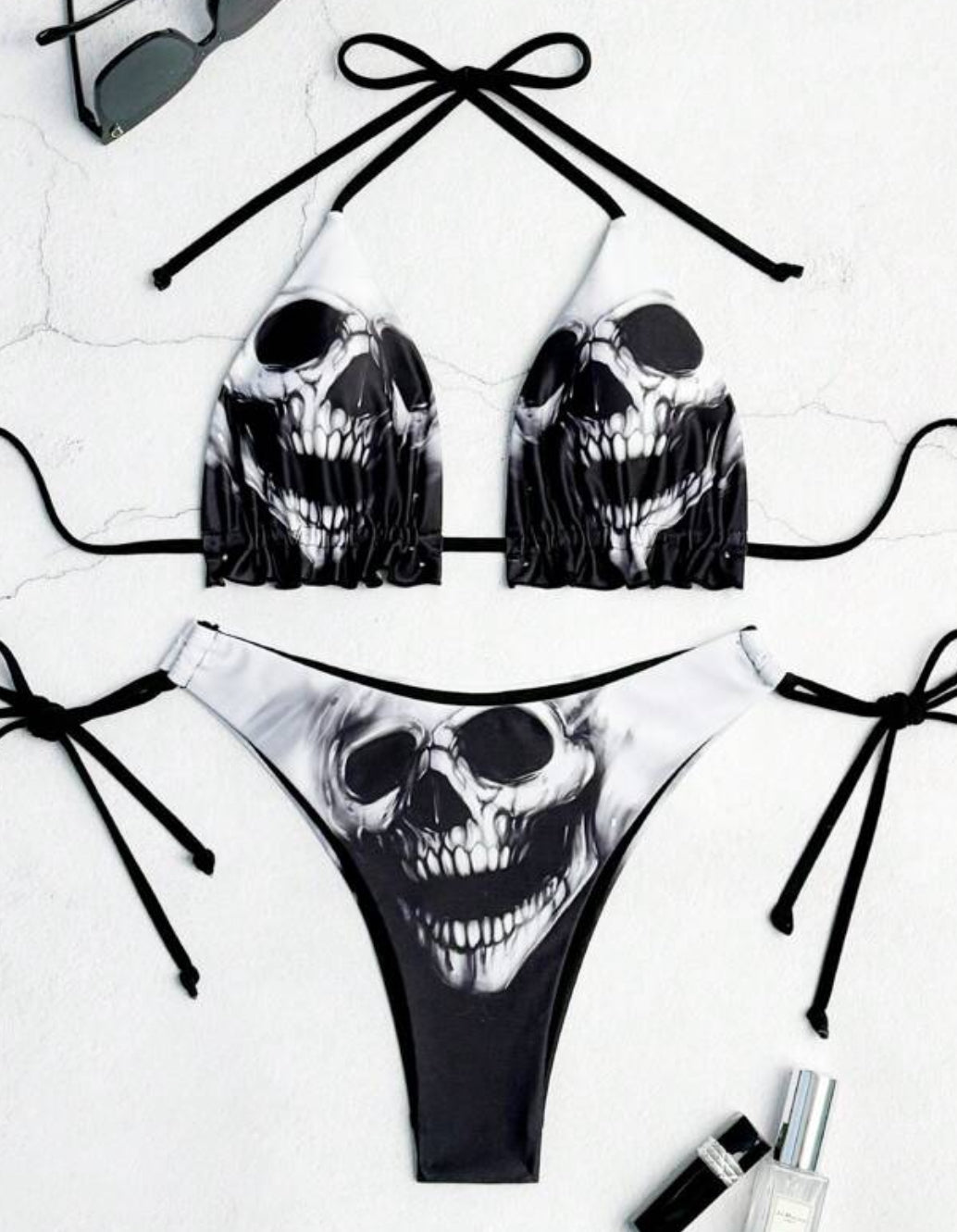 2-piece Skull print halter neck bikini set with removable pads made with high stretch