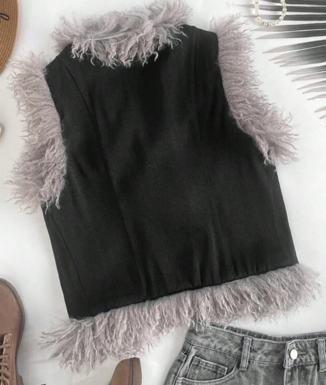 Casual Navy blue Woven vest with faux fur trimmed Tie in the front with no stretch vest