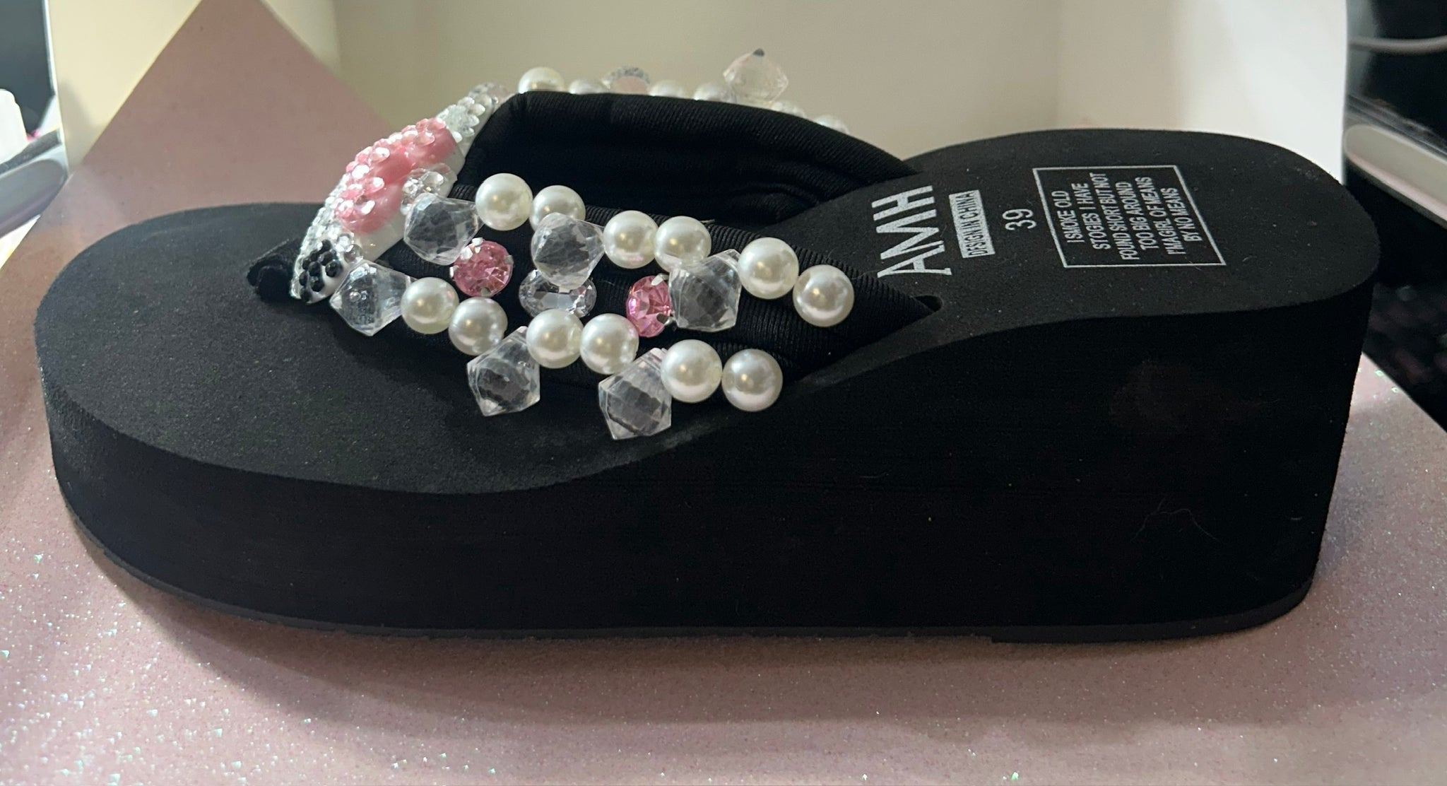 Hello kitty Rhinestone flip flop slide sandals with 1 1/2in platforms and 2 1/2in casual wedge heel