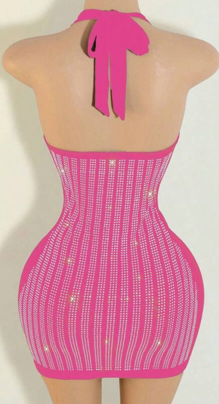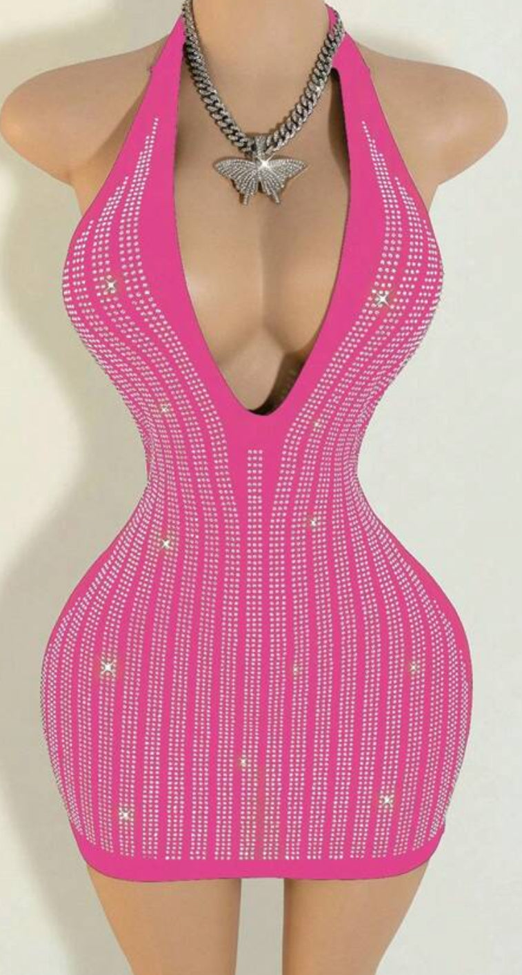 Hot Pink sexy plunging neck halter dress with rhinestone embellished mini dress with high stretch