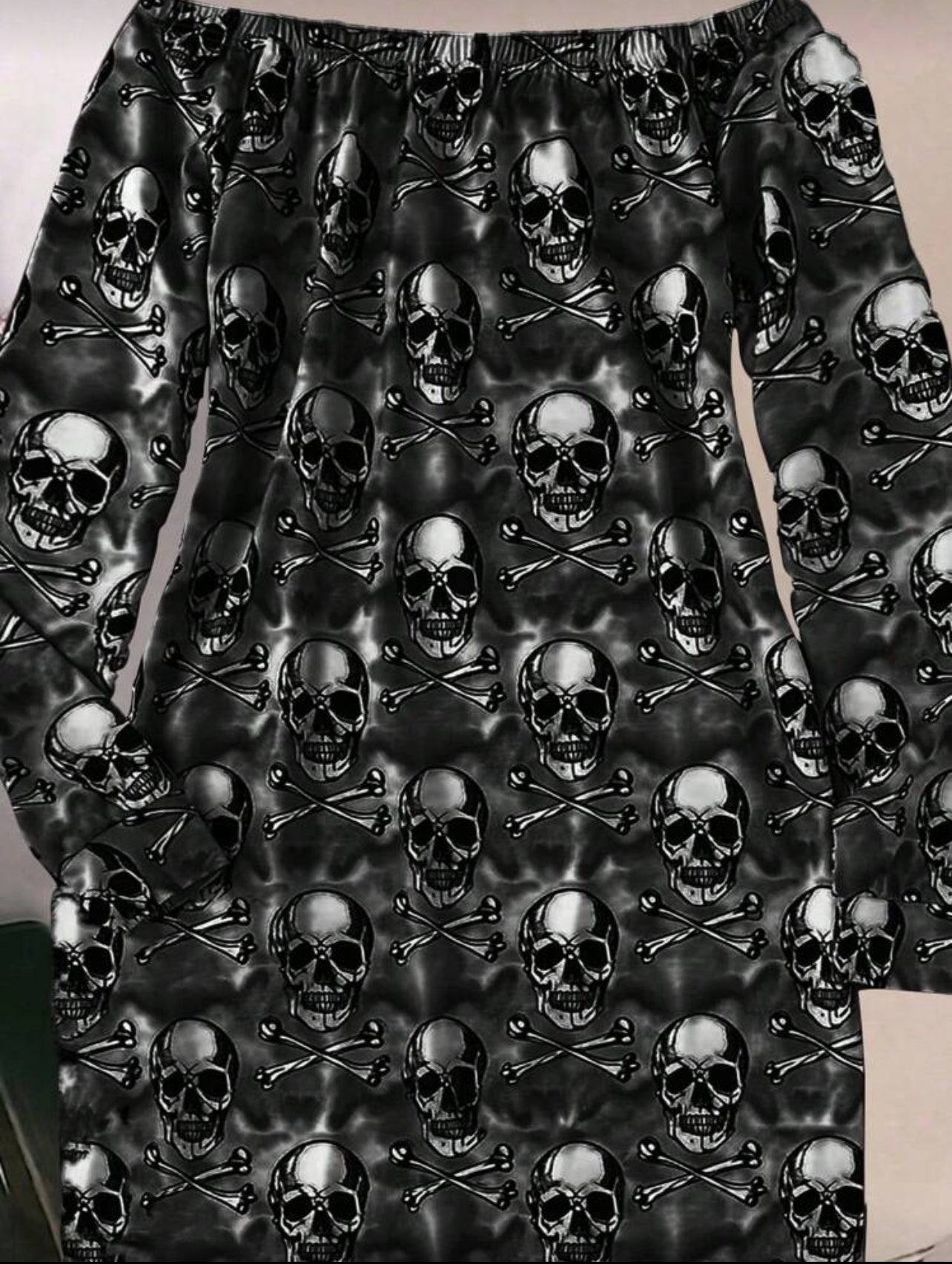 Black plus size off shoulder long sleeve mini dress with skulls and cross bones print made with slight stretch