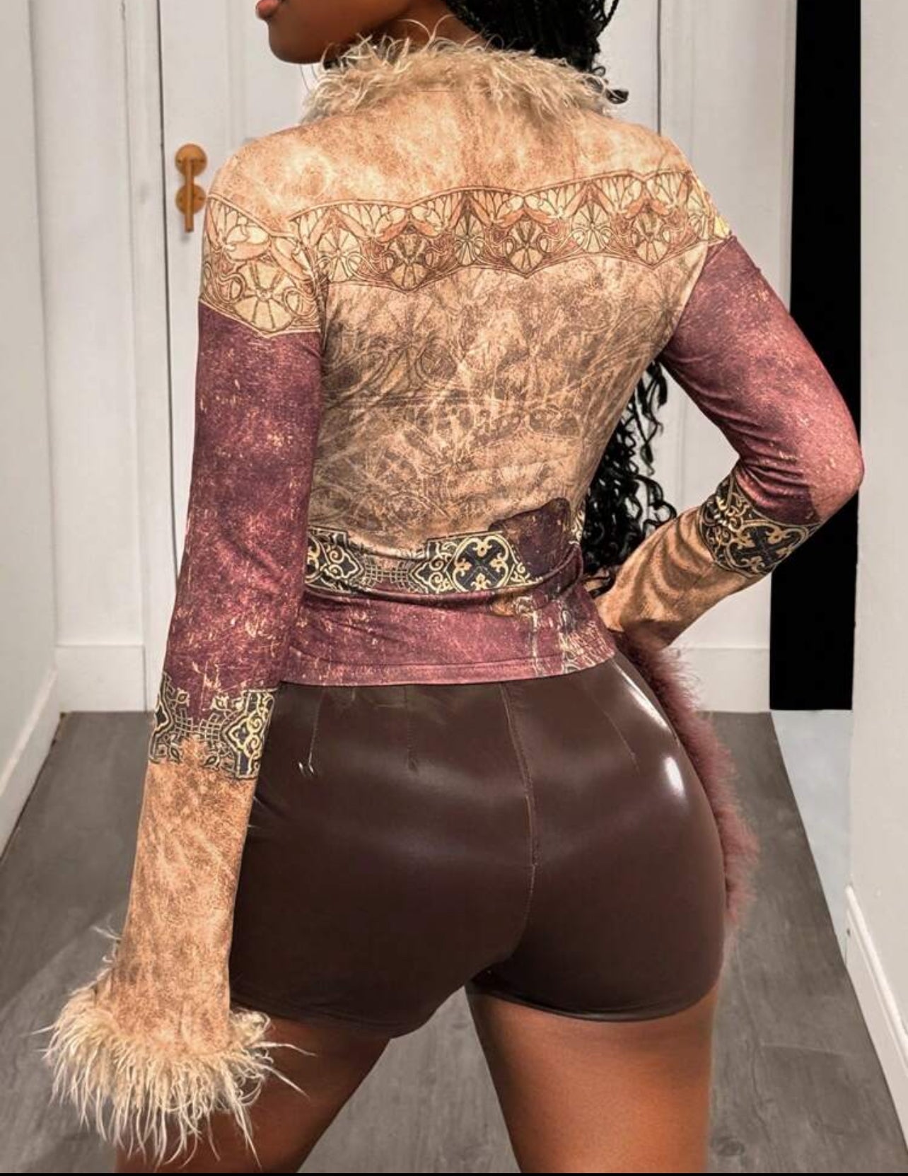 Long sleeve V-neck abstract print cardigan with fur cuffs and fur collar with tie in the front made with a medium stretch